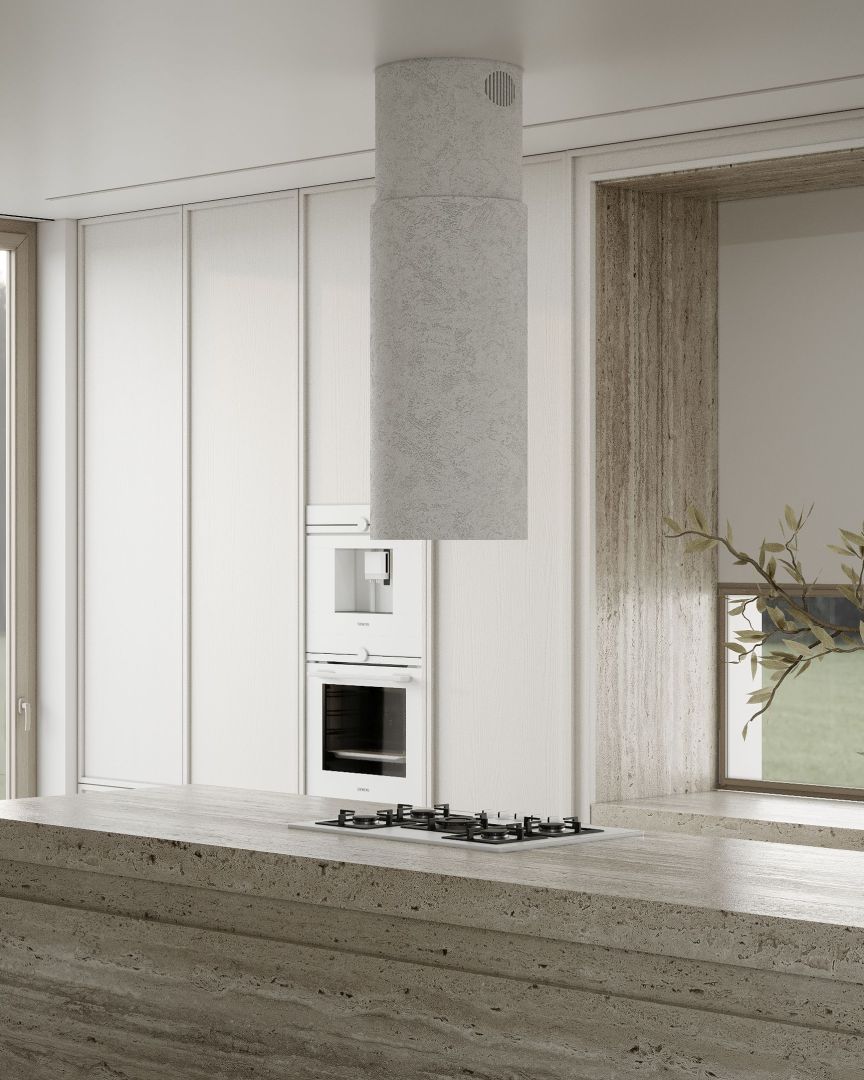 Digestor Nortberg Columni Stono Light Grey je dizajnový kuchynský digestor, ktorý vyniká elegantným tvarom pripomínajúcim klasický stĺp a bledosivým náterom imitujúcim surový architektonický betón. Dekoratívny povrch je vyrobený z inovatívnej zmesi cementu, živíc, vody a minerálnych pigmentov, čo dodáva produktu mimoriadnu odolnosť a moderný charakter.