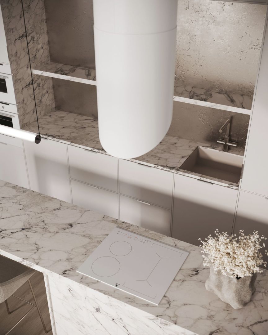 - Biela matná tu dominuje a zdôrazňuje jedinečný dizajn odsávača pár