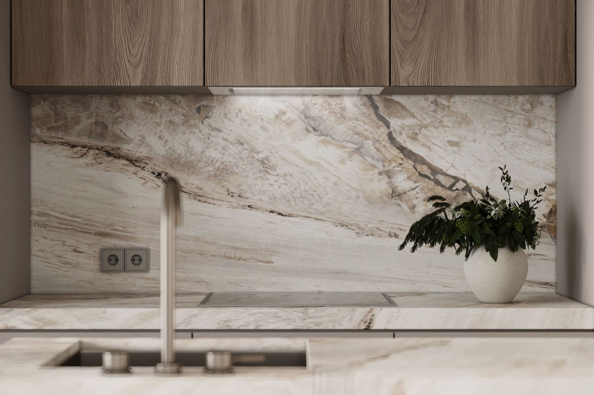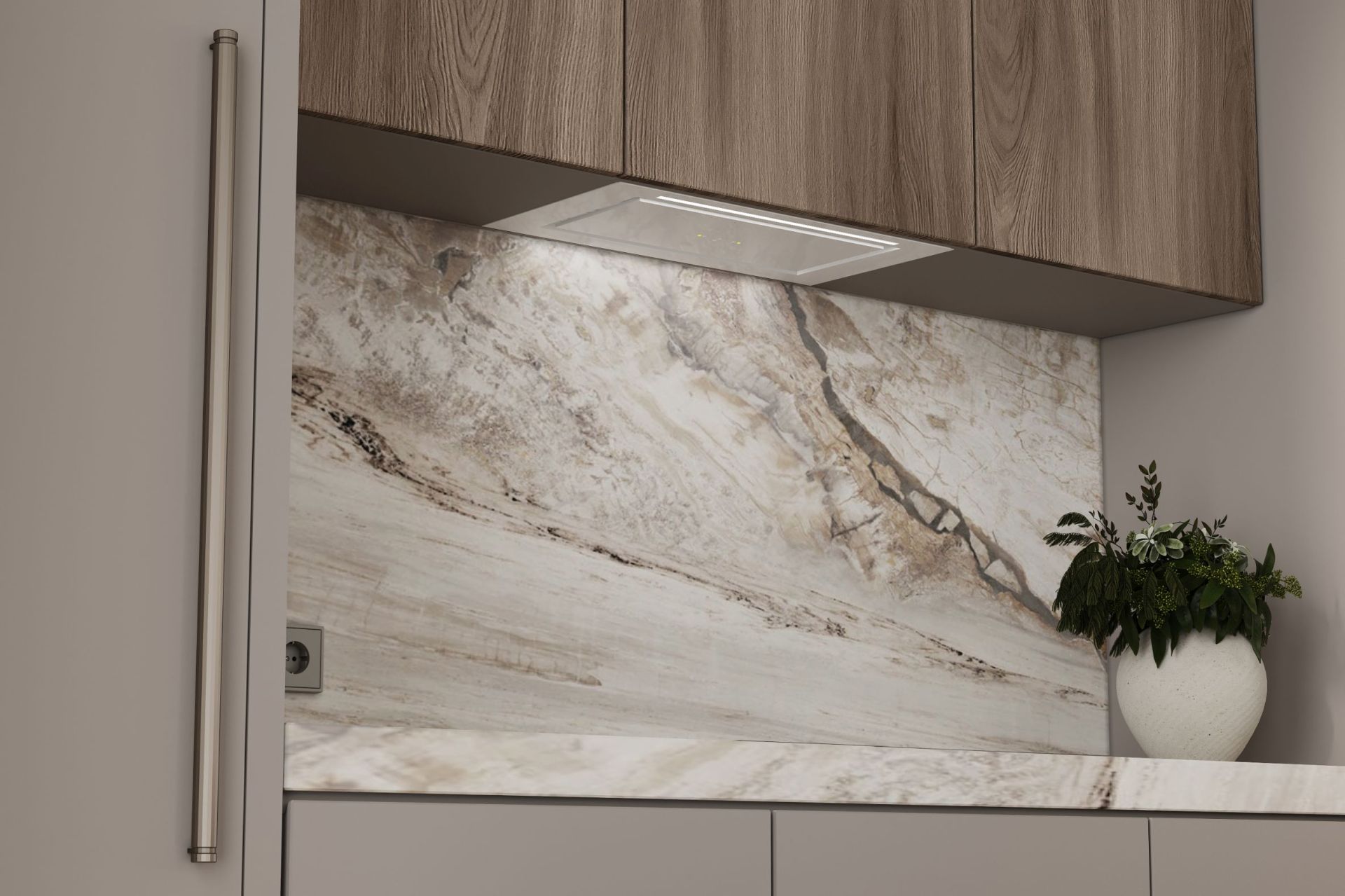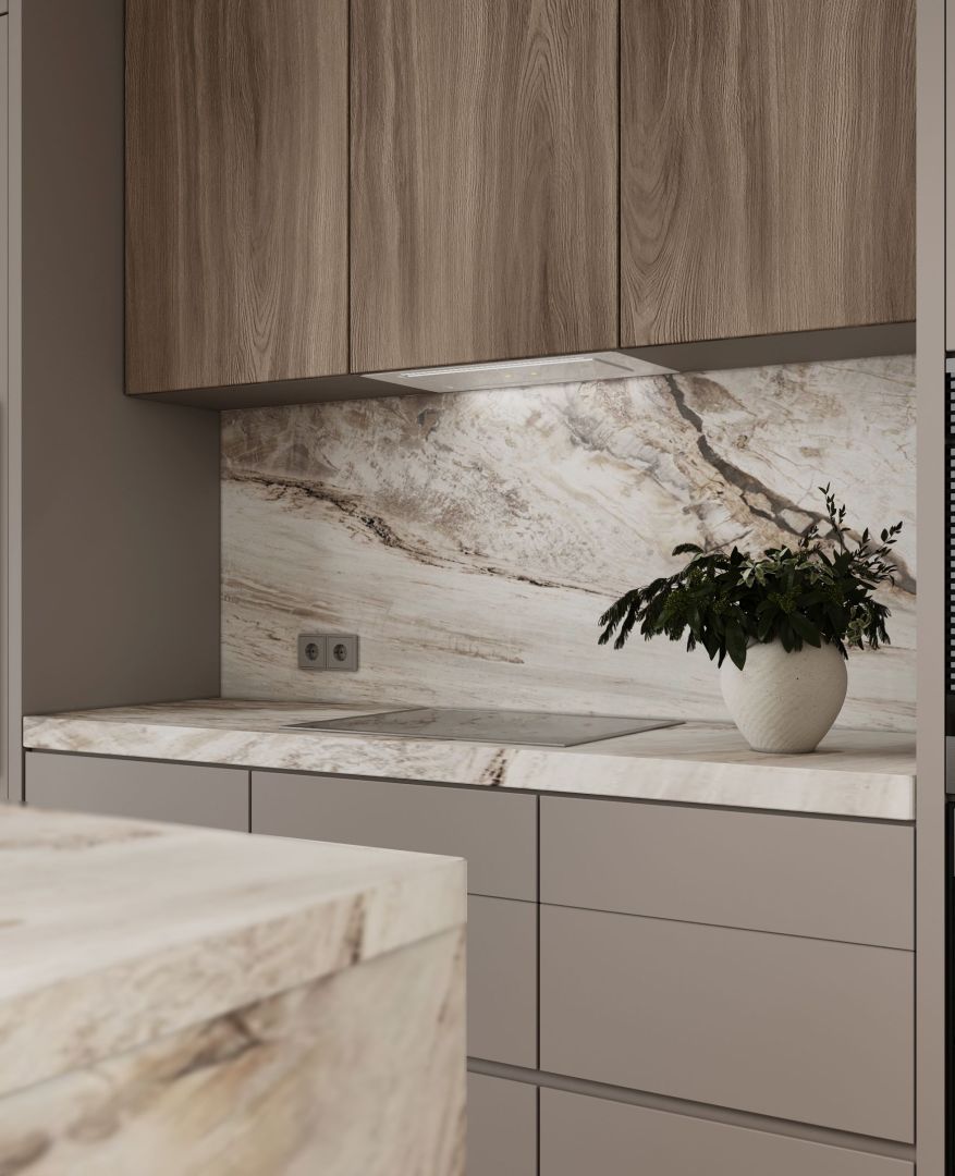 Digestor je zapustený do spodnej línie skriniek a stáva sa prakticky neviditeľným – nenarúša architektúru kuchyne a zároveň účinne chráni priestor pred vlhkosťou, pachmi a mastnotou. Jeho tvar – biela tvrdená sklenená tabuľa – je nielen esteticky príjemný, ale aj ľahko sa čistí a udržiava.