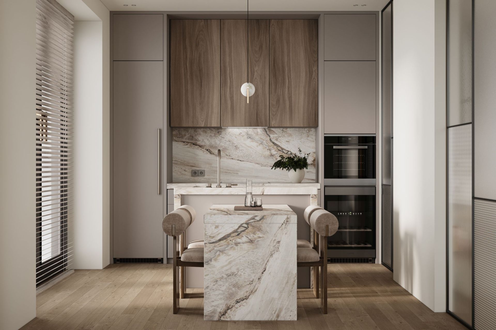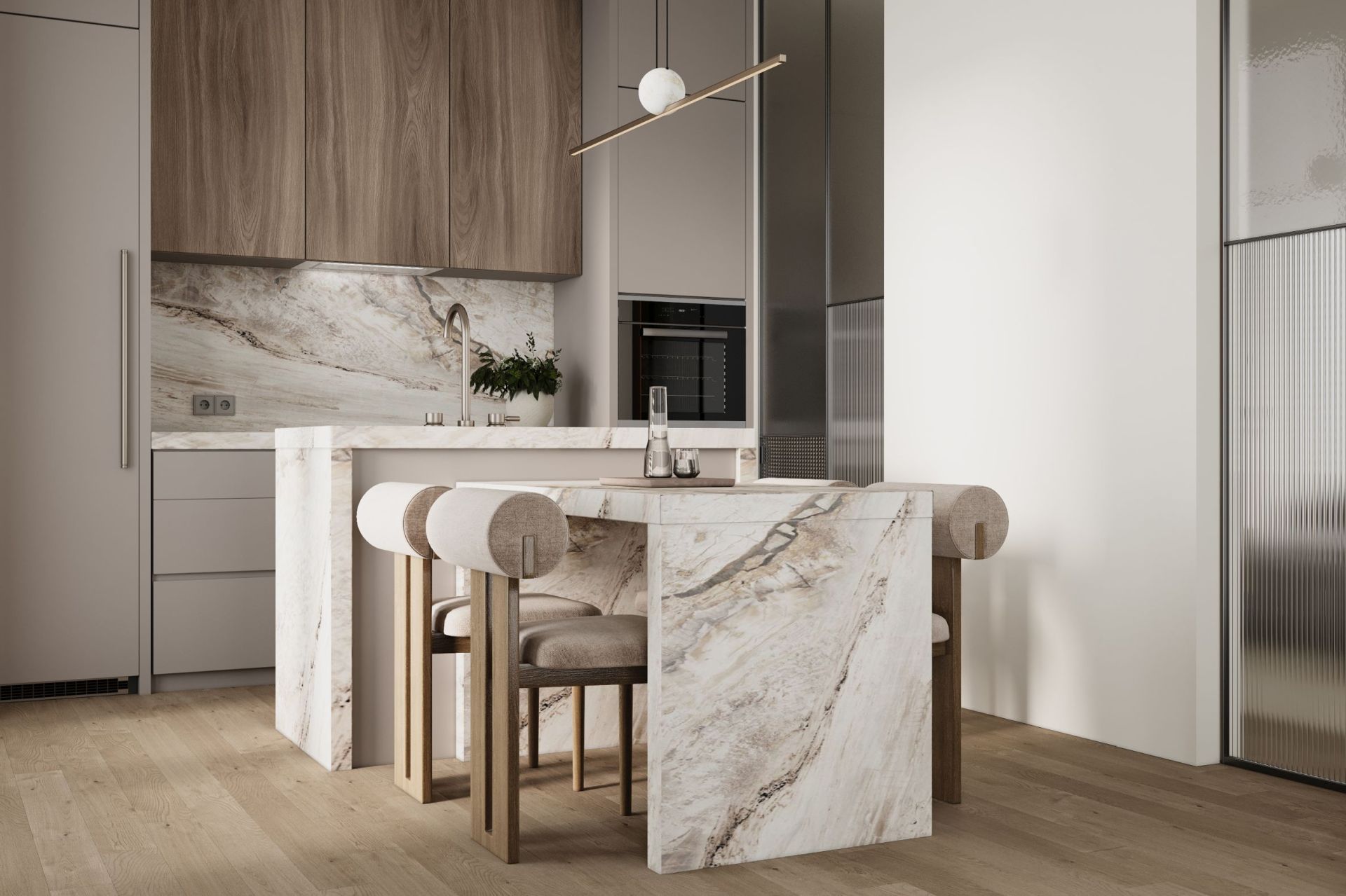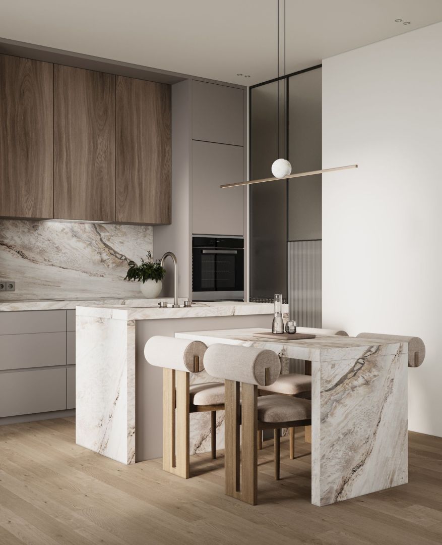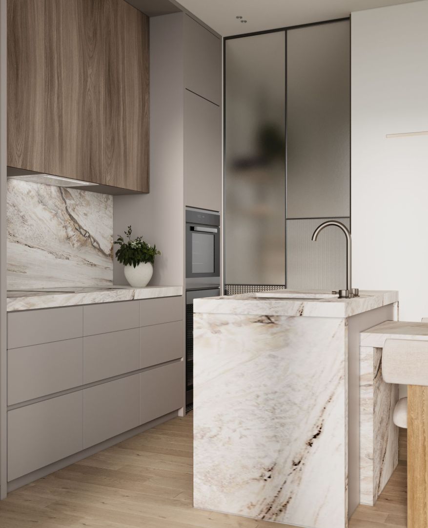 Digestor je zapustený do spodnej línie skriniek a stáva sa prakticky neviditeľným – nenarúša architektúru kuchyne a zároveň účinne chráni priestor pred vlhkosťou, pachmi a mastnotou. Jeho tvar – biela tvrdená sklenená tabuľa – je nielen esteticky príjemný, ale aj ľahko sa čistí a udržiava.