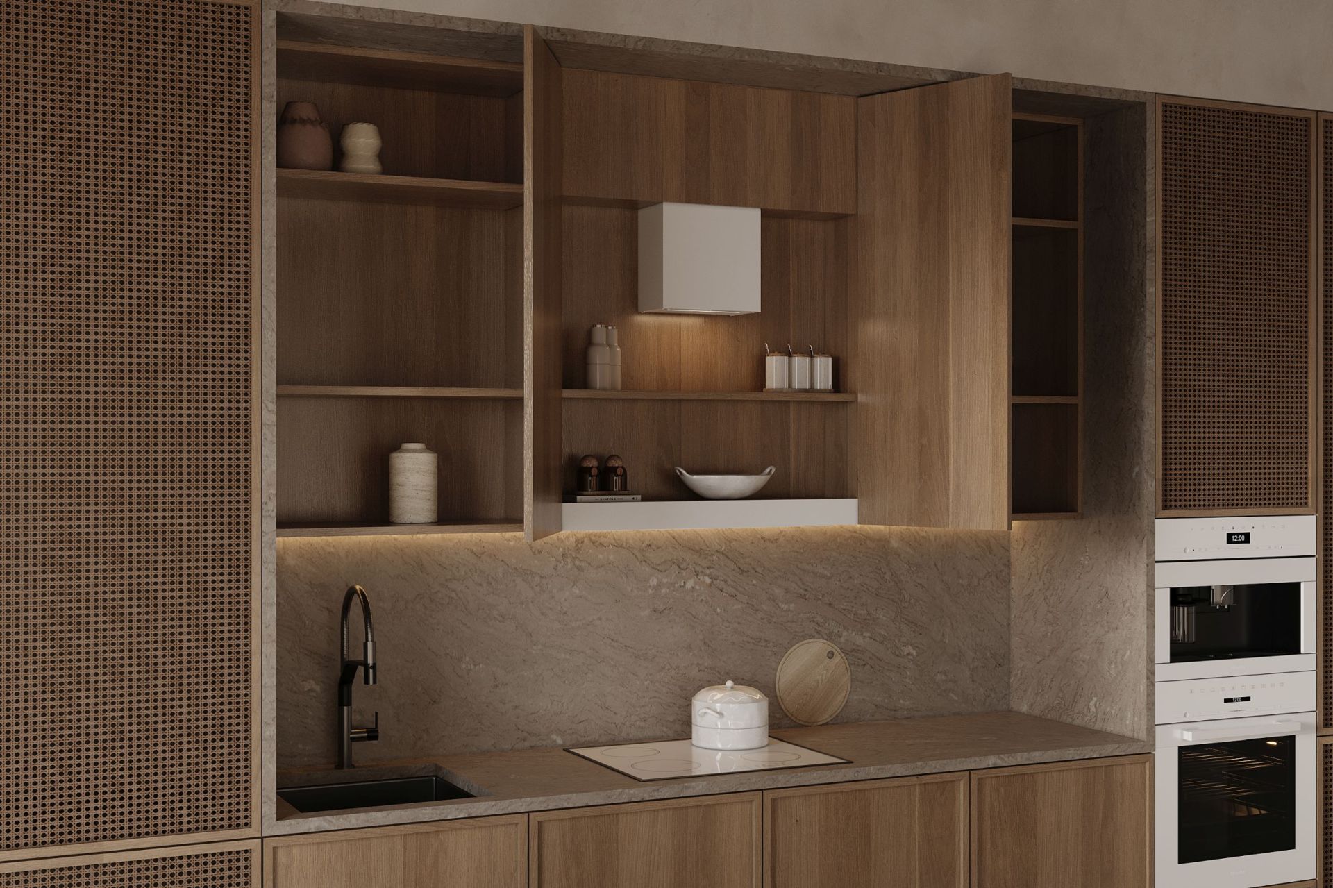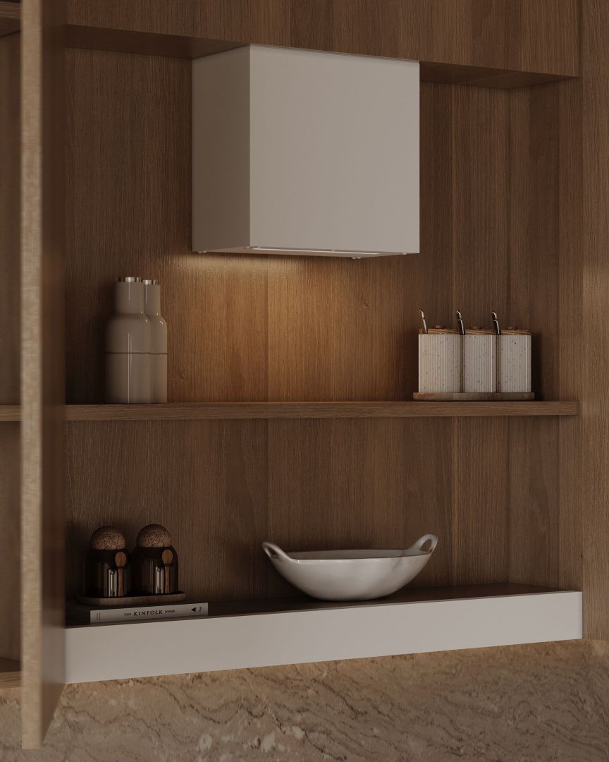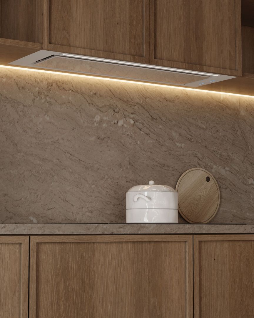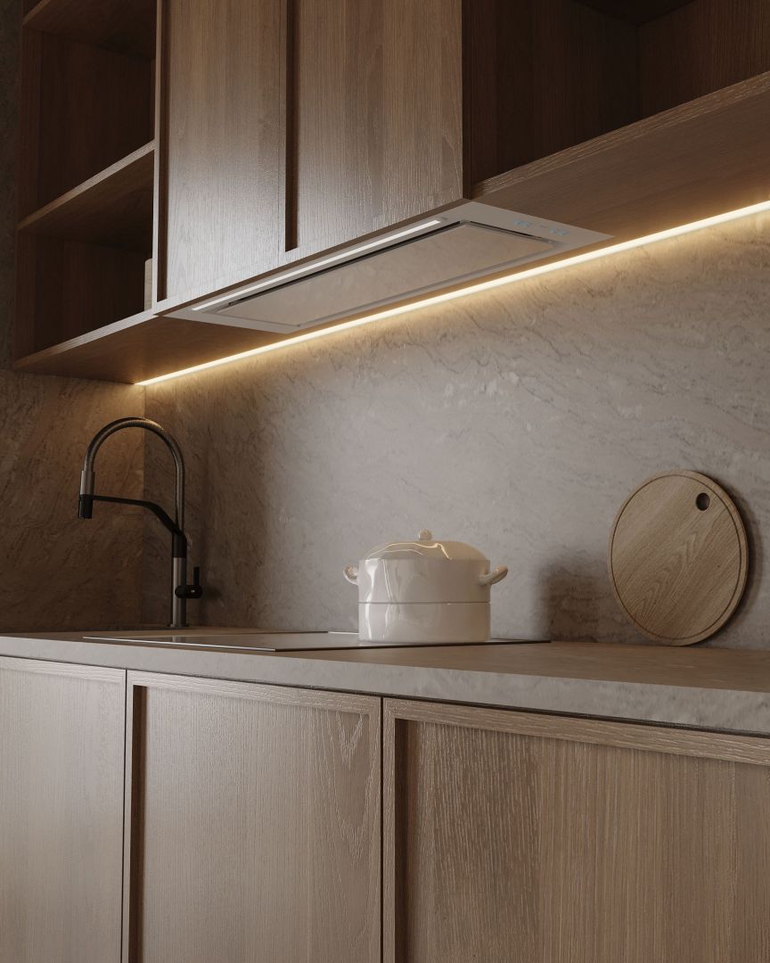 Vstavaný digestor v novom prevedení! Navrhnutý pre tých, ktorí si cenia funkčné využitie kuchynského priestoru. Skrytý v skrinke, ako klasický digestor pod skrinky, namiesto turbíny pripevnenej k telu má plochý vetrací kanál krásne skrytý krytom. Toto riešenie umožňuje stolárom prispôsobiť si interiér skrinky presne podľa želania klienta.