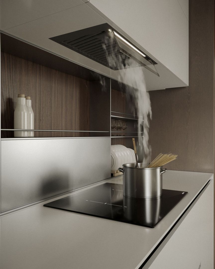 Predná strana jednotky je vybavená skleneným panelom, ktorý pri naklonení automaticky aktivuje LED osvetlenie s teplotou 4000 K. Neutrálne denné svetlo ideálne osvetľuje varnú dosku a zlepšuje komfort večerného varenia. Výklopné sklo nielenže dodáva eleganciu, ale tiež efektívne smeruje výpary do digestora, čím zvyšuje účinnosť odsávania.